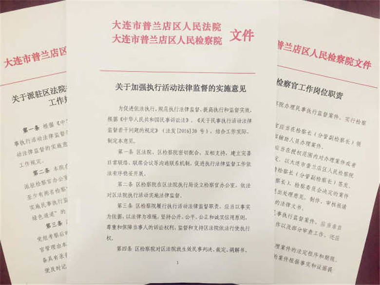 普兰店区人民检察院新一届院党组十分注重与区法院的密切配合和相互支持,建立完善了日常联络、联席会议等沟通联系机制。为进一步开展深入协作,促进法院执行活动依法进行,规范执行活动法律监督,提高执行和监督实效,区检察院党组多次召开党组会、检察长办公会,听取民事行政检察工作专题汇报、部署工作要点、大力支持和推动民事行政执行检察工作开展,研究加强民事行政执行监督工作的办法。检察长与区法院院长直接对话,反复就建立相关制度机制进行协商。在大连市人民检察院、大连市中级人民法院和普兰店区委、区政府、区委政法委的大力支持下,在区法检两院领导的强力推动下,区法检两院就设立法院执行部门派驻检察室达成共识,联合会签《关于加强执行活动法律监督的实施意见》,规定了对区法院执行活动启动监督的八种情形和对拒绝履行、拒不协助、妨碍执行的有关单位进行依法监督的四种情形,并对监督程序和问题处理方案进行了细化,内部制定了《派驻检察官办公室开展执行检察的工作规定》、《派驻检察官工作岗位职责》,指导和规范派驻检察官的日常工作和职能定位。